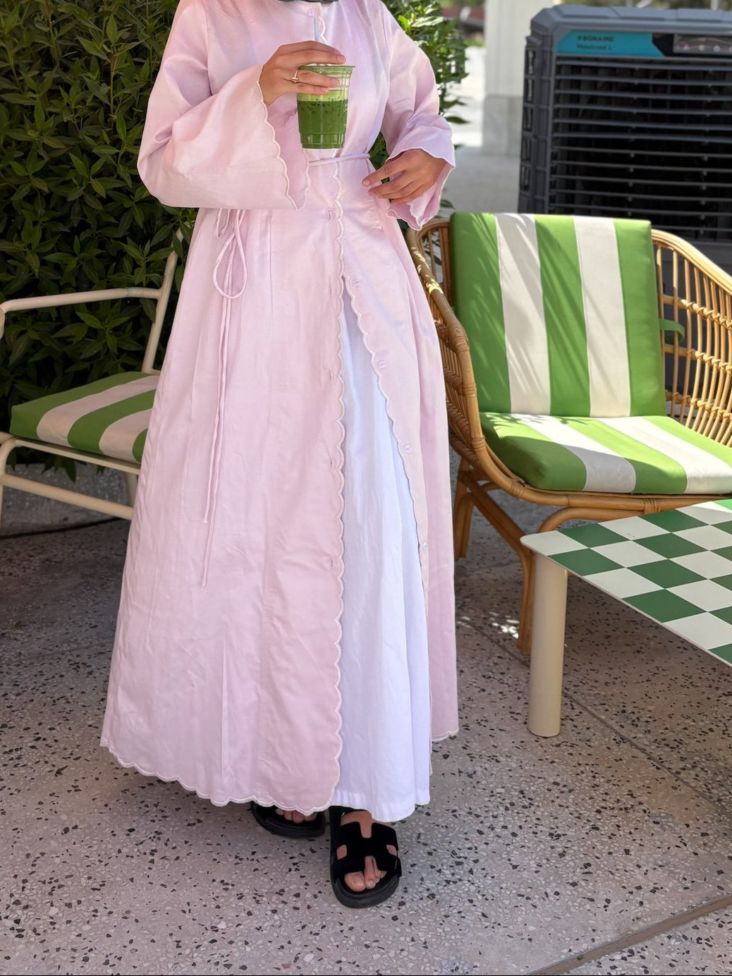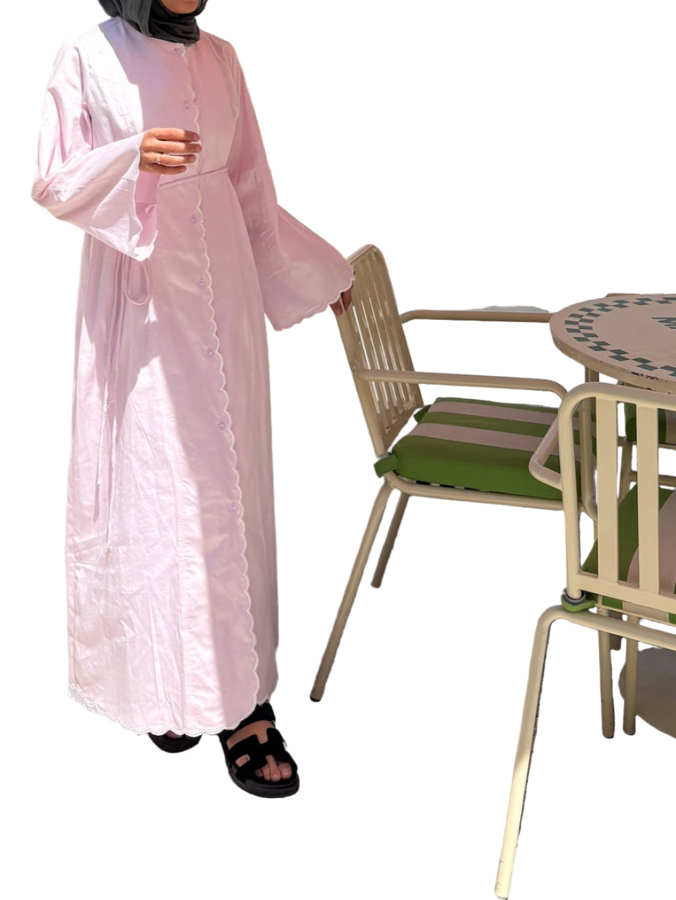This cotton dress features a delicately embroidered scalloped edge, adding a refined touch to its classic design. Crafted from breathable fabric, it ensures comfort while maintaining a polished look. Ideal for both casual and semi-formal occasions, the dress combines elegant detailing with everyday wearability.